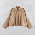 Maak kennis met deze statement bomber jacket in een warme camel-beige tint – het ultieme item voor wie op zoek is naar moeiteloze stijl met een luxe uitstraling. Deze oversized jas combineert klassieke tailoring met hedendaagse streetwear elementen voor een look die zowel verfijnd als relaxed is.